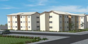 Cada apartamento possui 42,17 m² divididos em sala, cozinha, área de serviço, banheiro social e dois quartos. O condomínio está em construção.